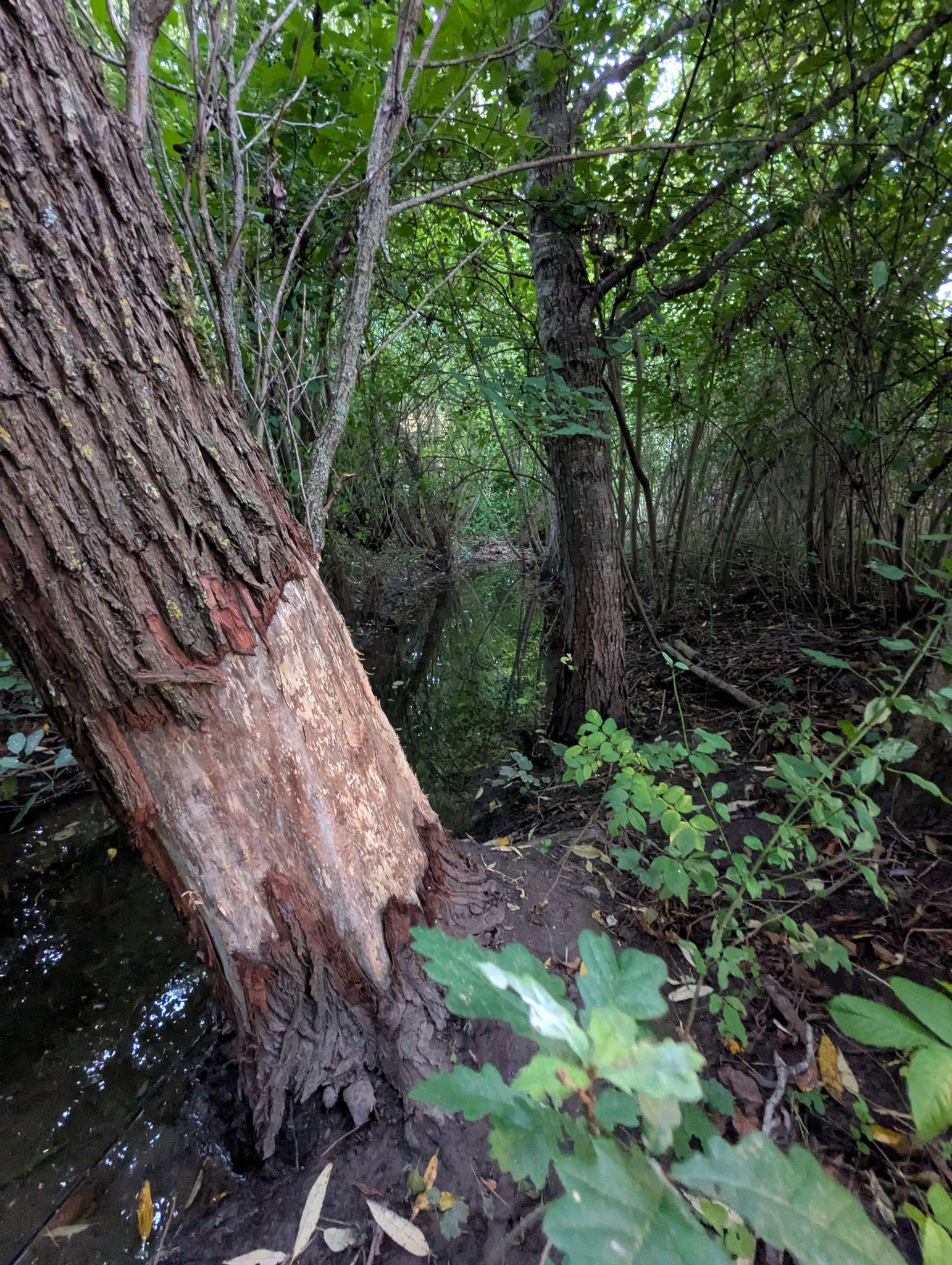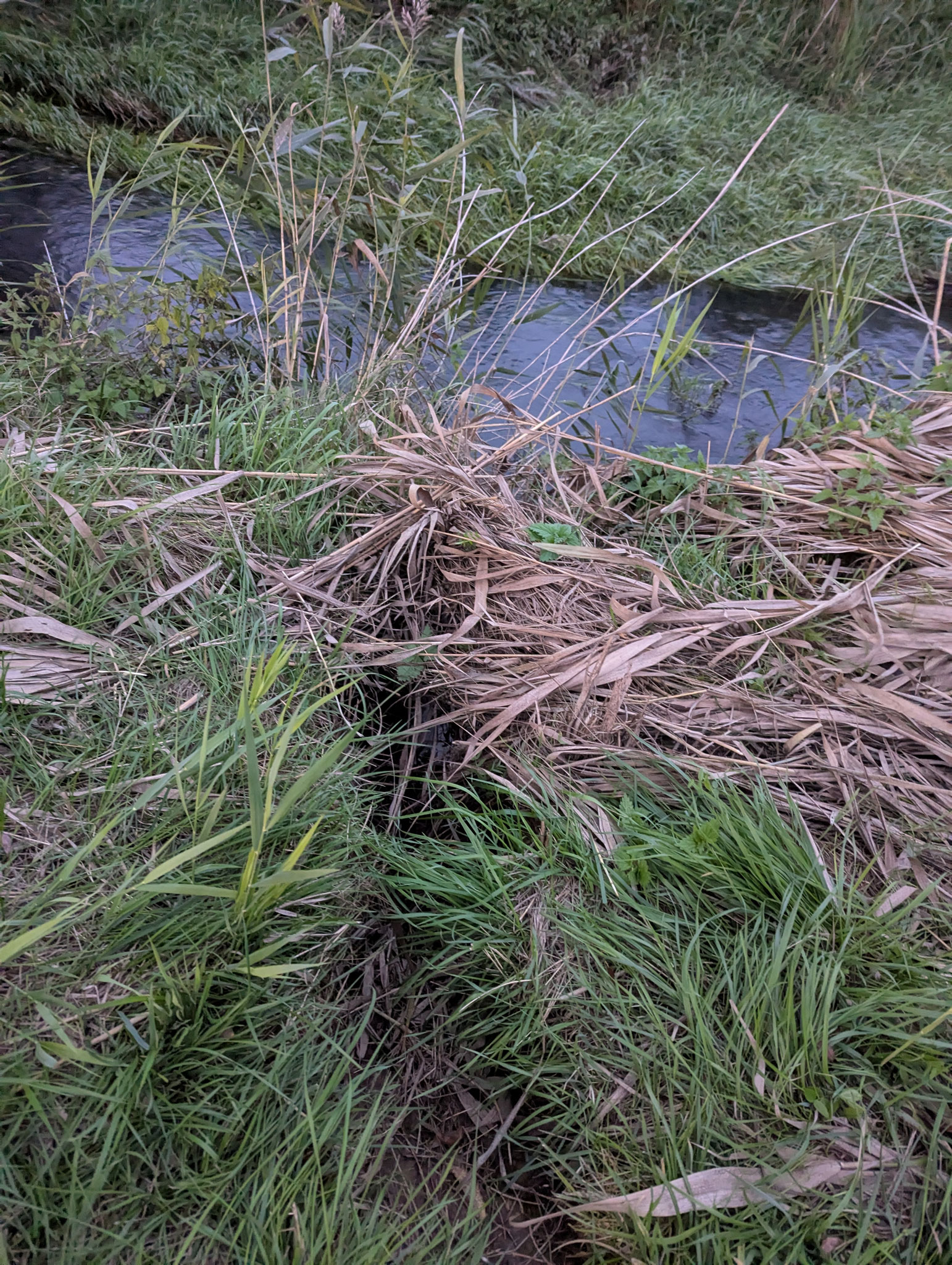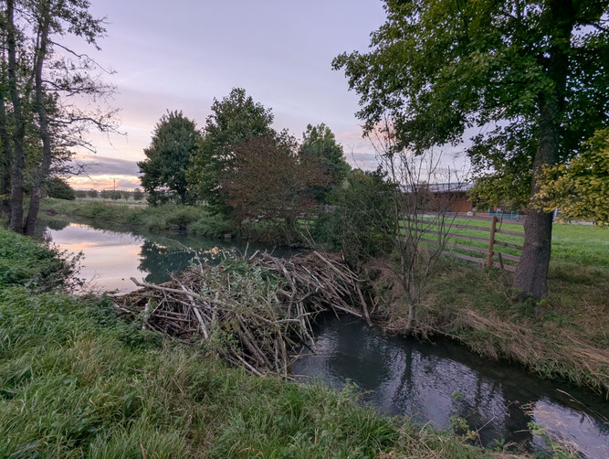 Nach dieser Einführung machten wir uns auf den Weg. Schon nach wenigen Schritten entdeckten wir die ersten angenagten Weiden. Je weiter wir dem Salzgraben folgten, desto mehr Spuren fanden wir. Die erste Biberburg lag kurz vor der Brücke Richtung Ammer. Markus Bihler erklärte, dass der Biber dort weiterhin lebe, und bat uns, leise in einer Reihe vorbeizugehen, um ihn nicht zu stören. Der Bereich war abgesperrt, da ein Teil des Baus eingestürzt war. Weiter an der Ammer entdeckten wir schließlich einen imposanten Damm, an dem der Höhenunterschied von rund zwei Metern deutlich sichtbar war.
